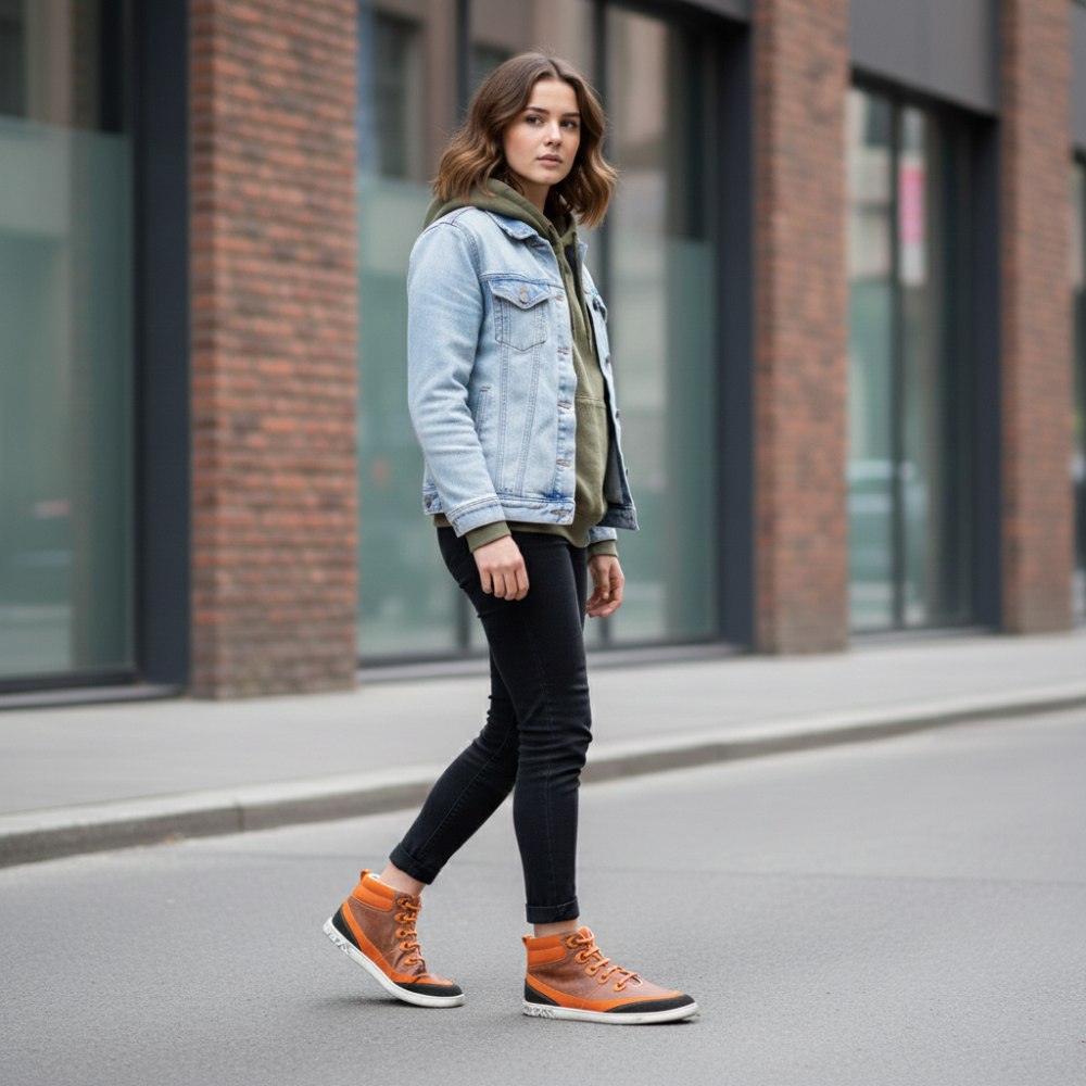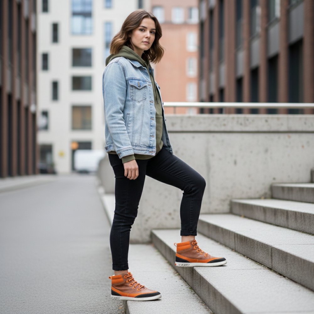 Deze mid-gesneden blote voetschoen inspireert met zijn moderne look en onderscheidt zich zeker van de menigte. De opvallende sinaasappel is een opwindende symbiose met de aardse bruine toon. Fijne details zoals de hand -sewn patches op de veters geven onze Cinco een brutale look.