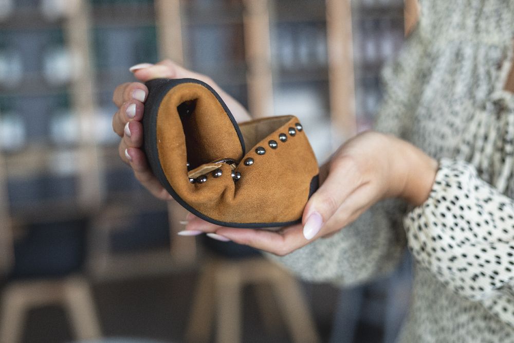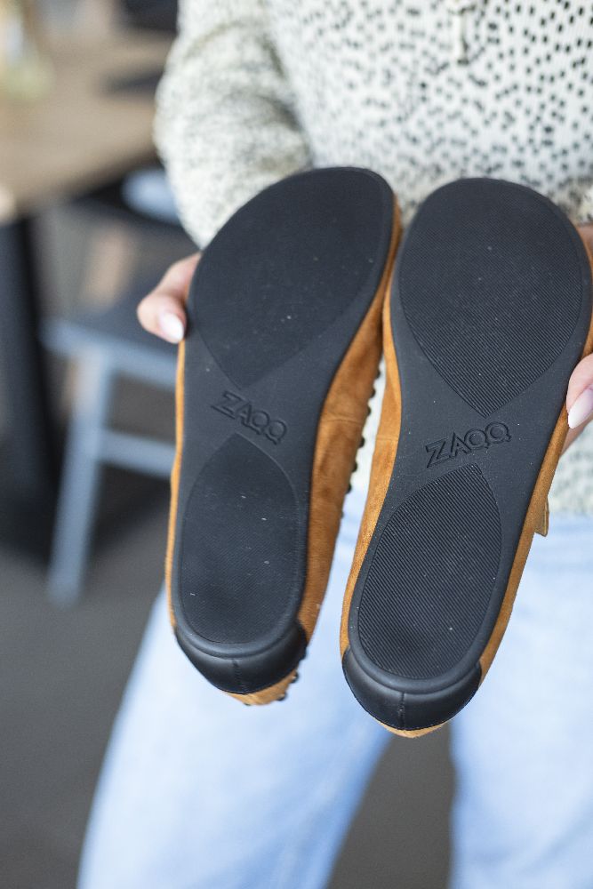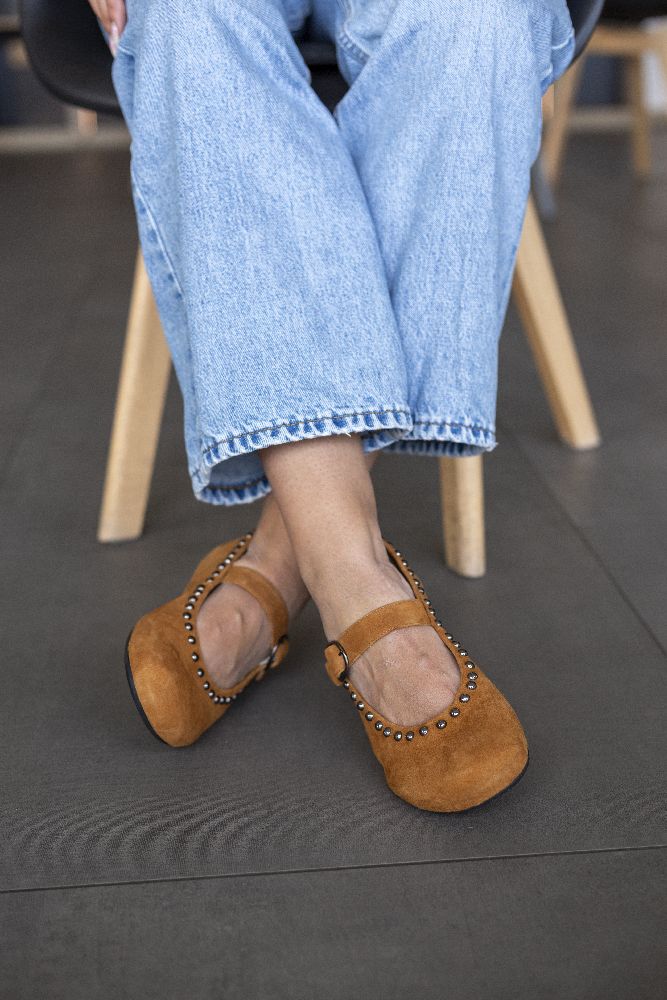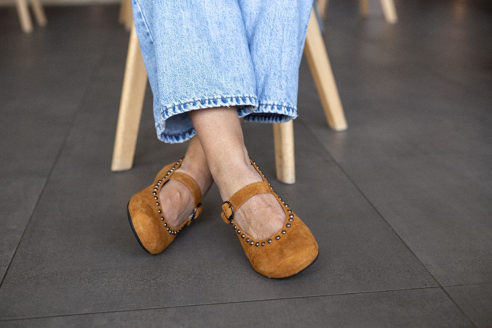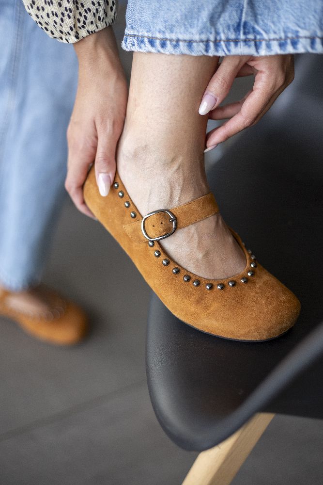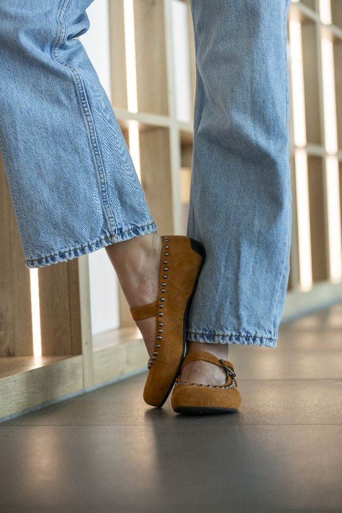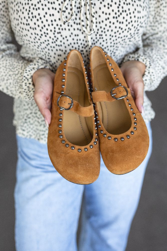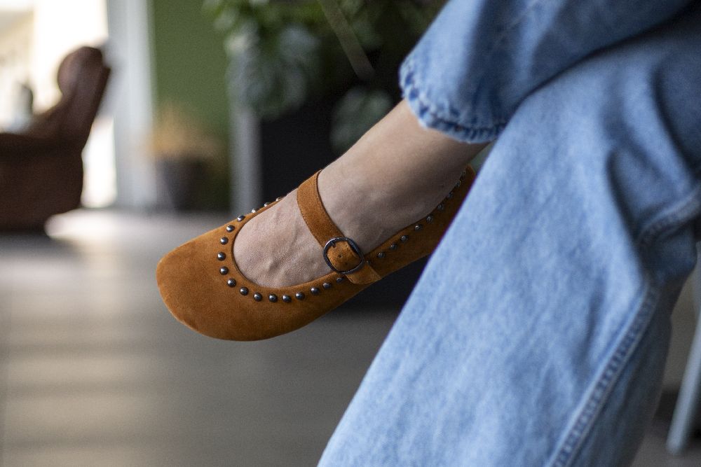 Onze Dieqo Brown is onze gloednieuwe ballerin -schoen gemaakt van bruin suede. Dit sieraad is bekleed met ronde klinknagels en geeft elke outfit een vleugje glamour, zonder af te zien van het ongelooflijke comfort dat je gewend bent van onze blote voetenschoenen.