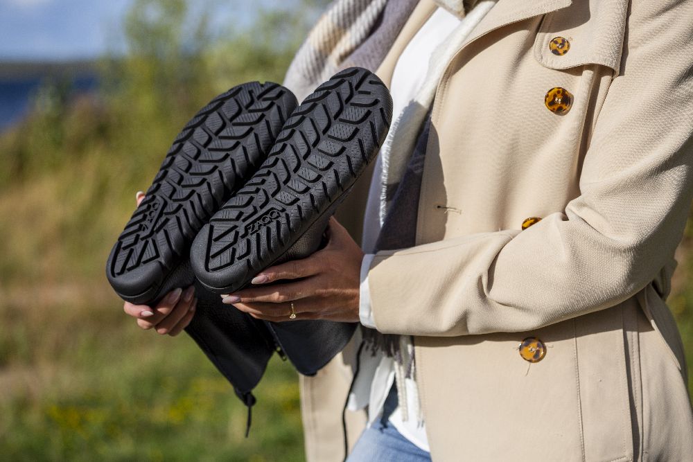 - Rubberen zool met nulhiel, waardoor de wervelkolom wordt verlicht en de gewrichten beschermt, ondersteunt de natuurlijke houding
