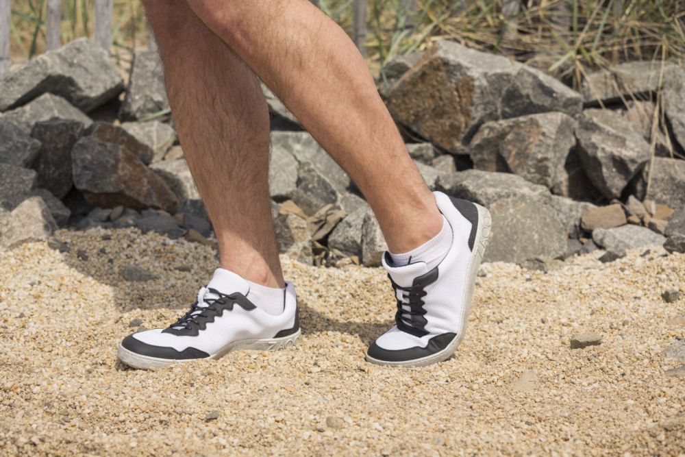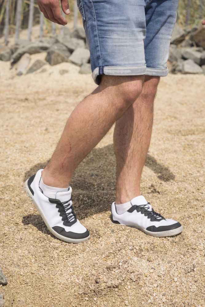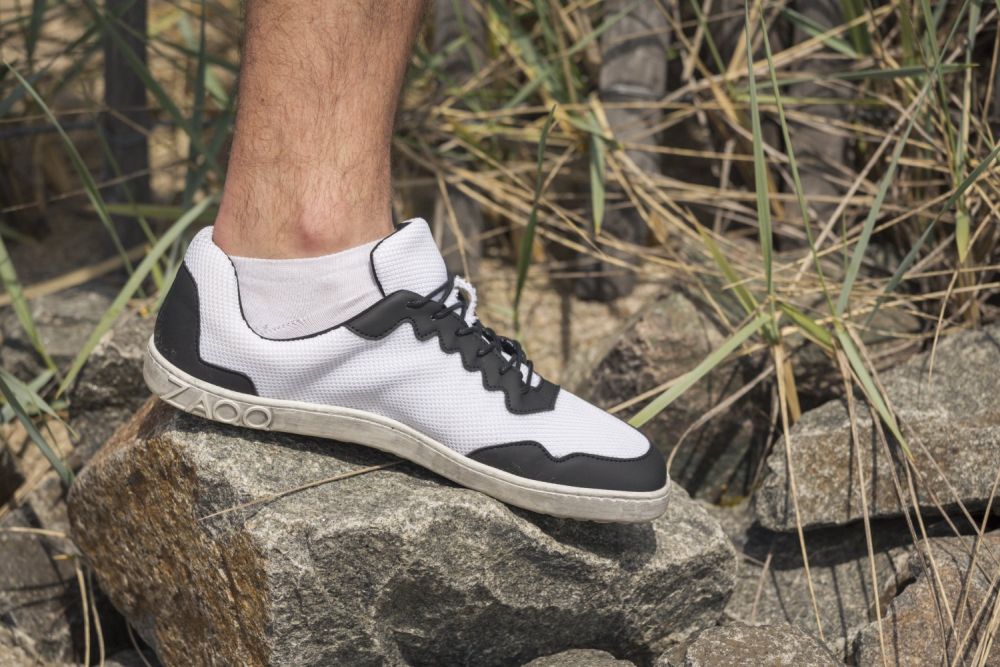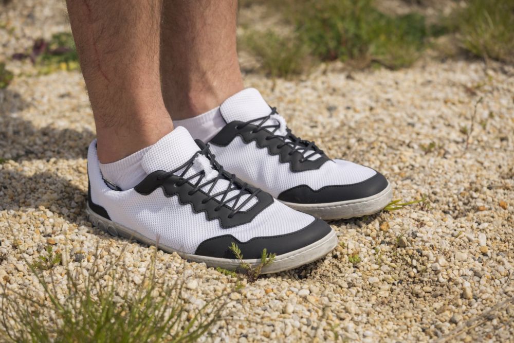 Met zijn wit-zwarte mix van materialen is de heldere blote voet sneaker niet alleen visueel de hit, maar ook functioneel.