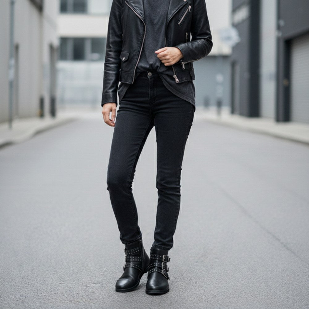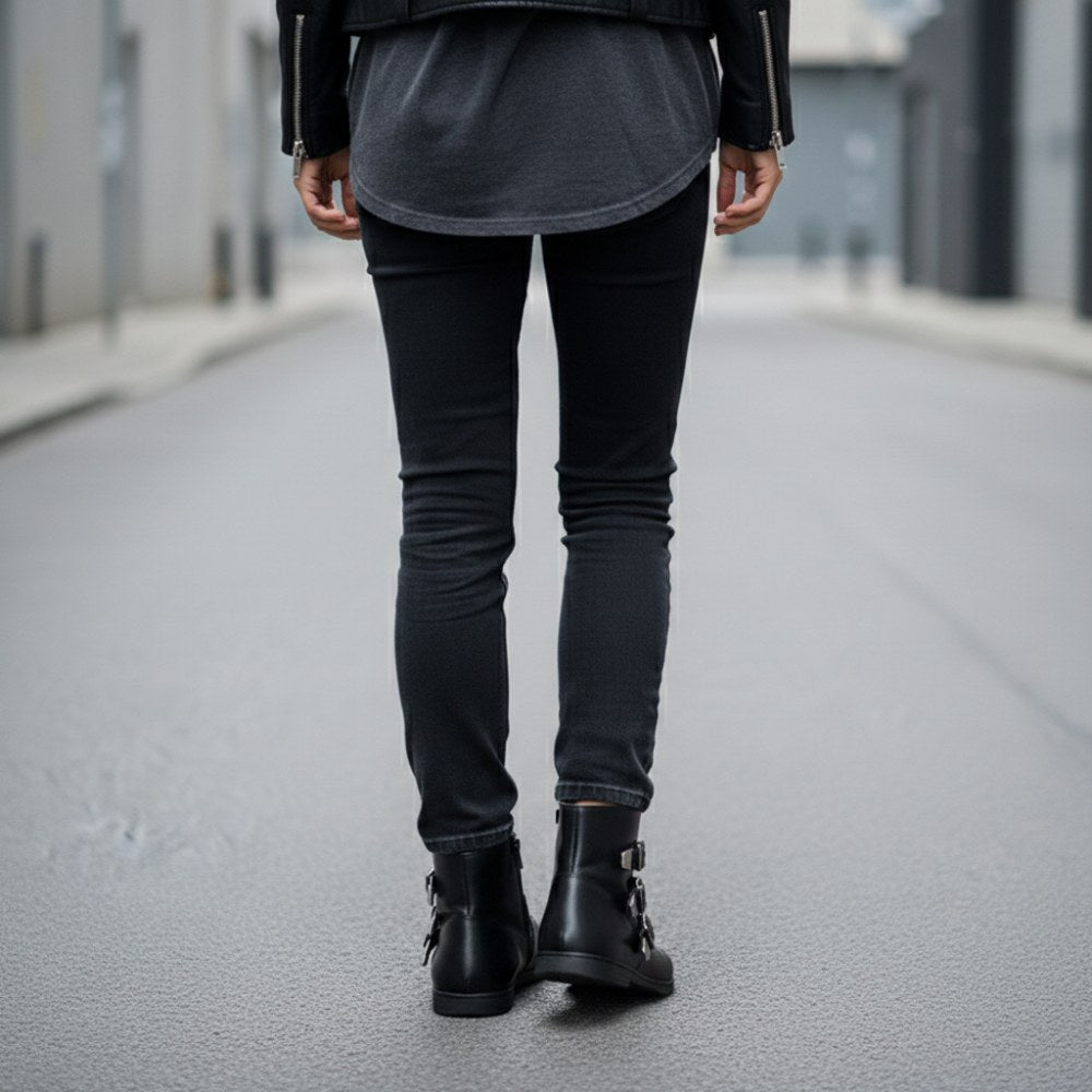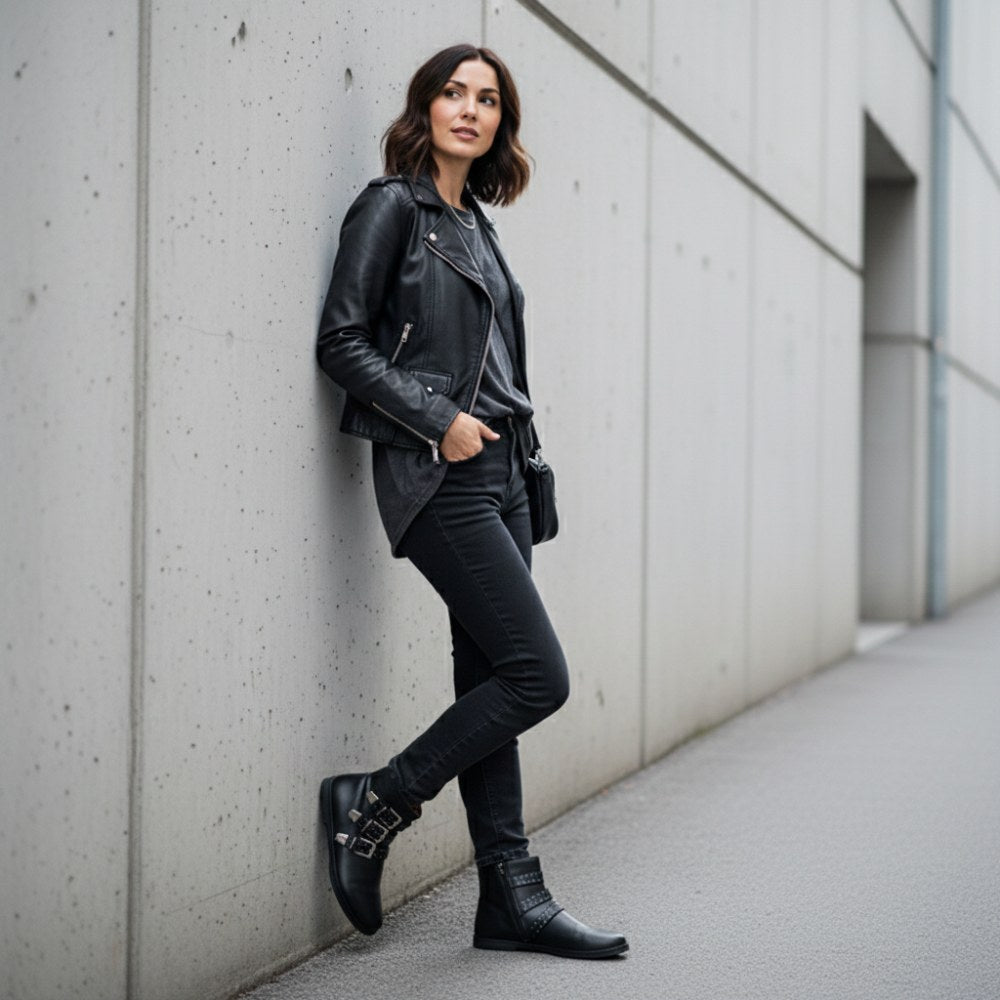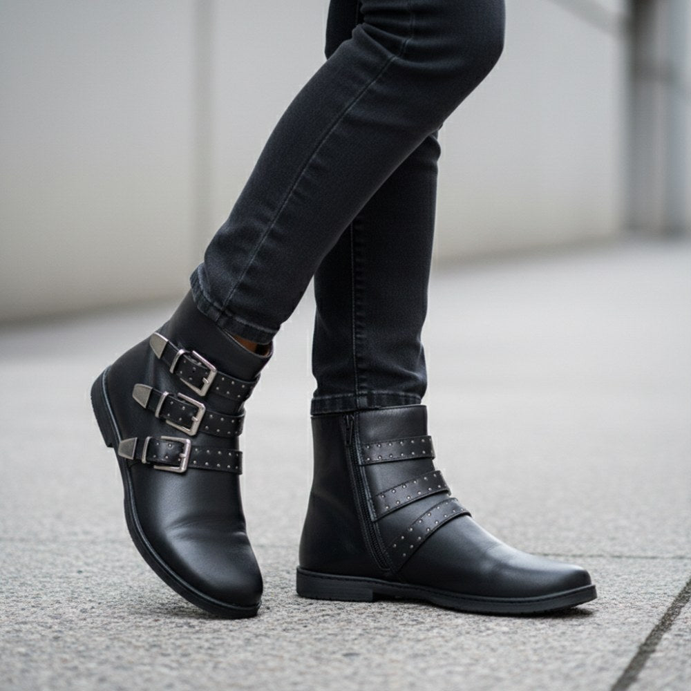 Vanwege de drie gespen, ziet deze blote voetboot er nog steeds rotsachtig uit en past perfect bij casual jeans.